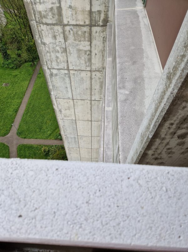 Vorne im Bild, die Brüstung meines Gemüsebalkons, wo jede Katze hochhüpfen kann,dann rechts das Betonelement vorstehend, was bis zu meiner Dachterrasse geht, links unten die Wege, das Grass, wenn eine Katze runterfällt, sind es 13 Stockwerke Flug mit irgendwelchen Brüchen.
